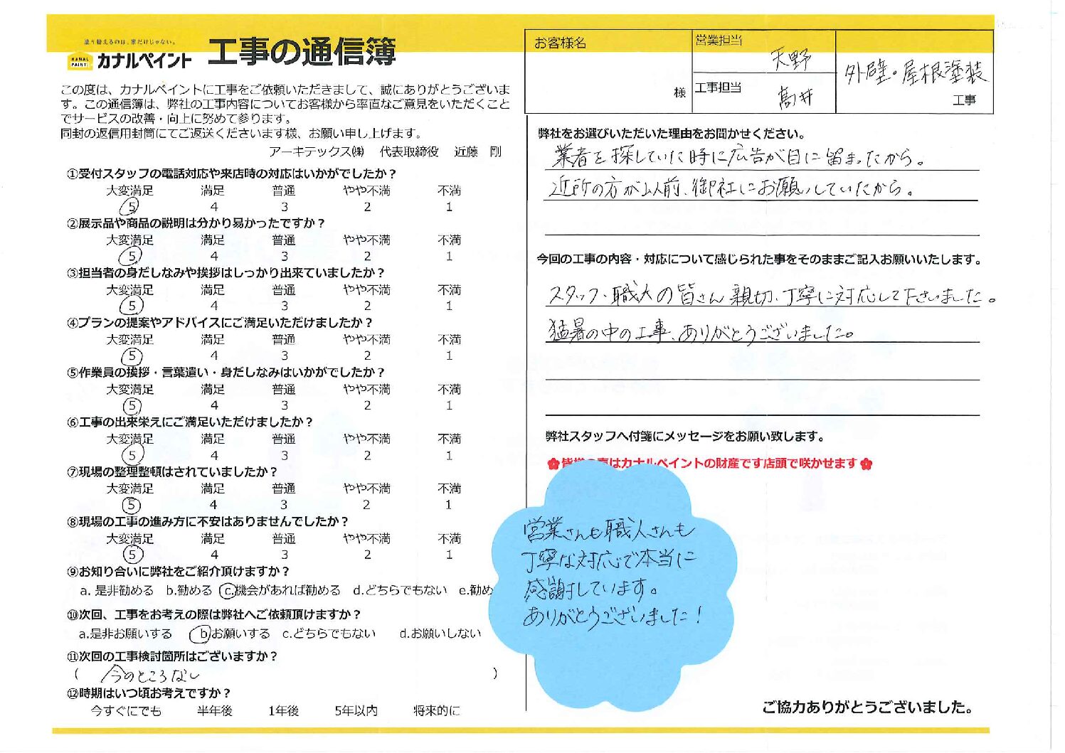 お客様より工事に関わったスタッフへのメッセージ