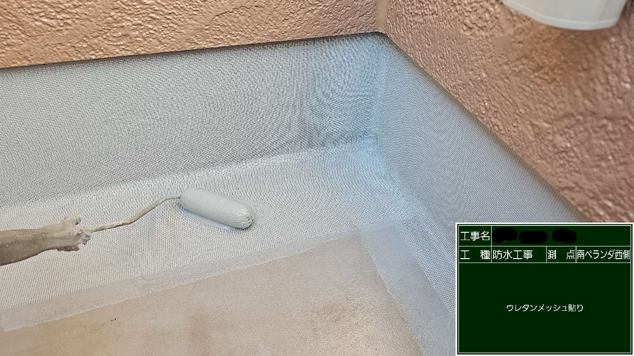 ベランダ防水 ウレタンメッシュ貼り