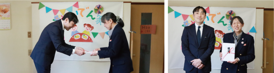 後日同所で行われた総会では、日頃おいでん家を支援していらっしゃるボランティアさんたちの前で、寄付金の目録を贈呈。