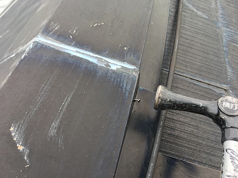 また、スレート屋根には一番頂上にある板金(棟板金)という部分や屋根の両端にも板金があります。それらを抑えている釘も浮いている場合がよく見受けられます。