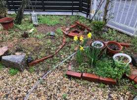 既存の砂利や花壇を一旦撤去して、土壌を整えていきます。