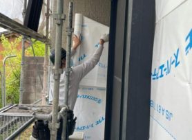 外壁からの雨漏りを防止するために防水紙を貼り付けていきます。