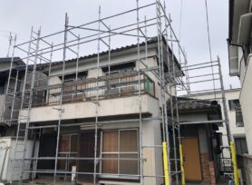 足場を組み立てた後はメッシュシートでお家全体を覆って