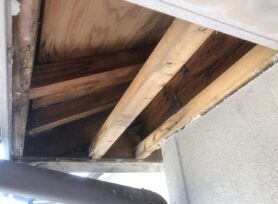 軒天は傷みが進行し、剥がれてしまっていると雨水による木材の腐食や