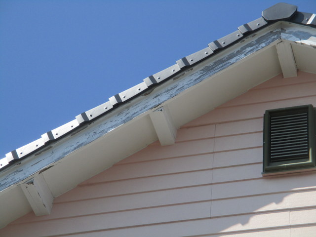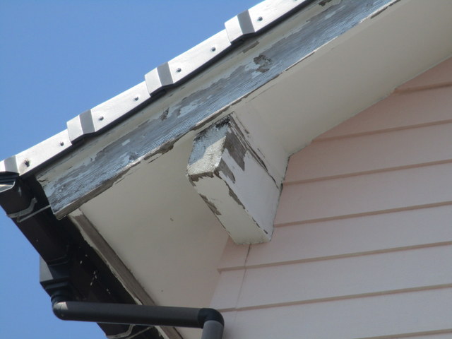 今回、破風板(斜めに付いている木板)劣化のため、塗装ではなく板金を張って保護する工事を行いました。