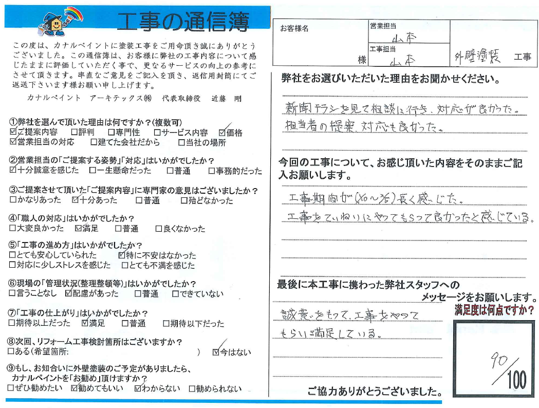 今回の工事について、お感じ頂いた内容をそのままご記入お願いします。