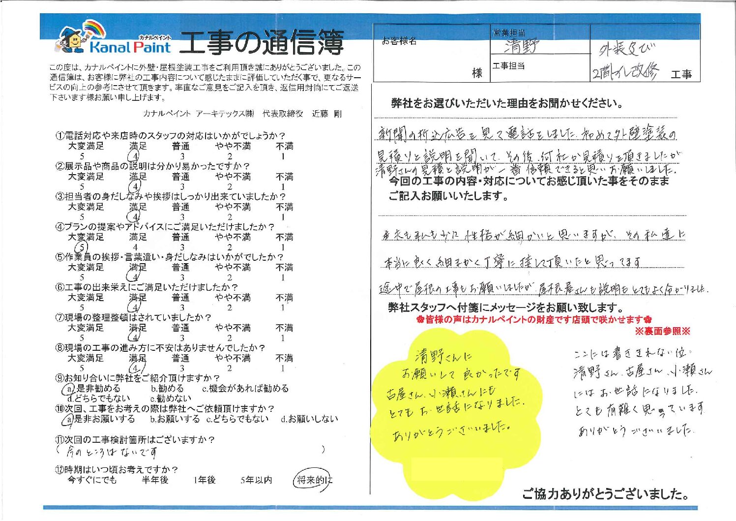 新聞の折込広告を見て電話をしました。初めて外壁塗装の見積りと説明を聞いて、その後、何社か見積りを頂きましたが清野さんの見積りを説明が一番信頼できると思いお願いしました。