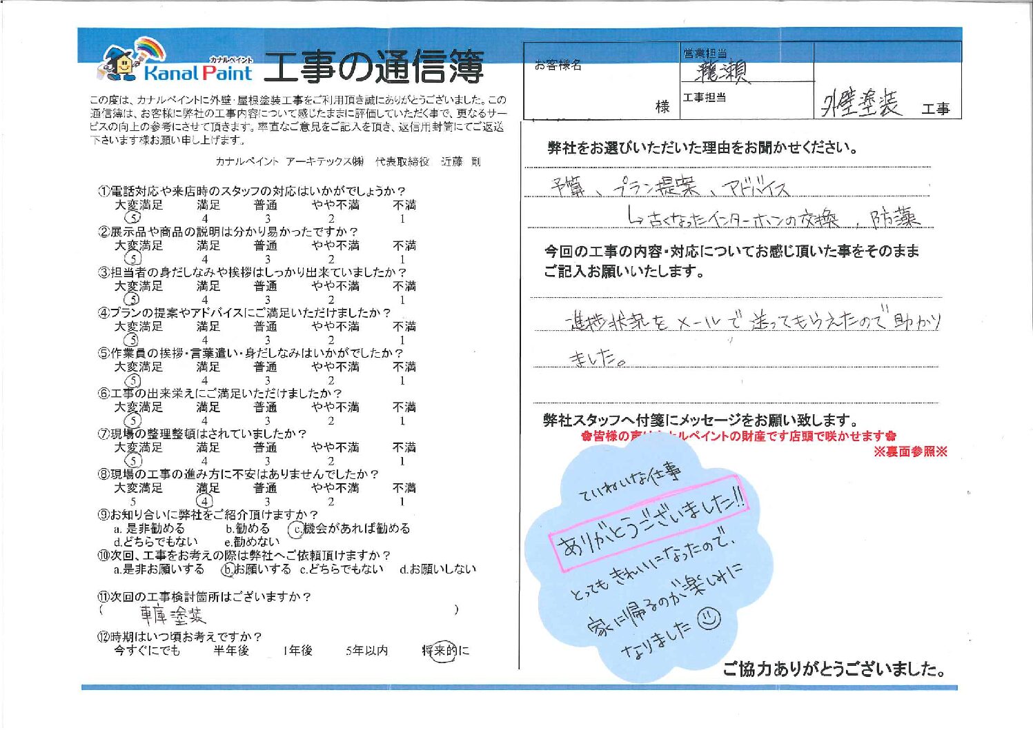 今回の工事の内容・対応についてお感じ頂いた事をそのままご記入お願いいたします。