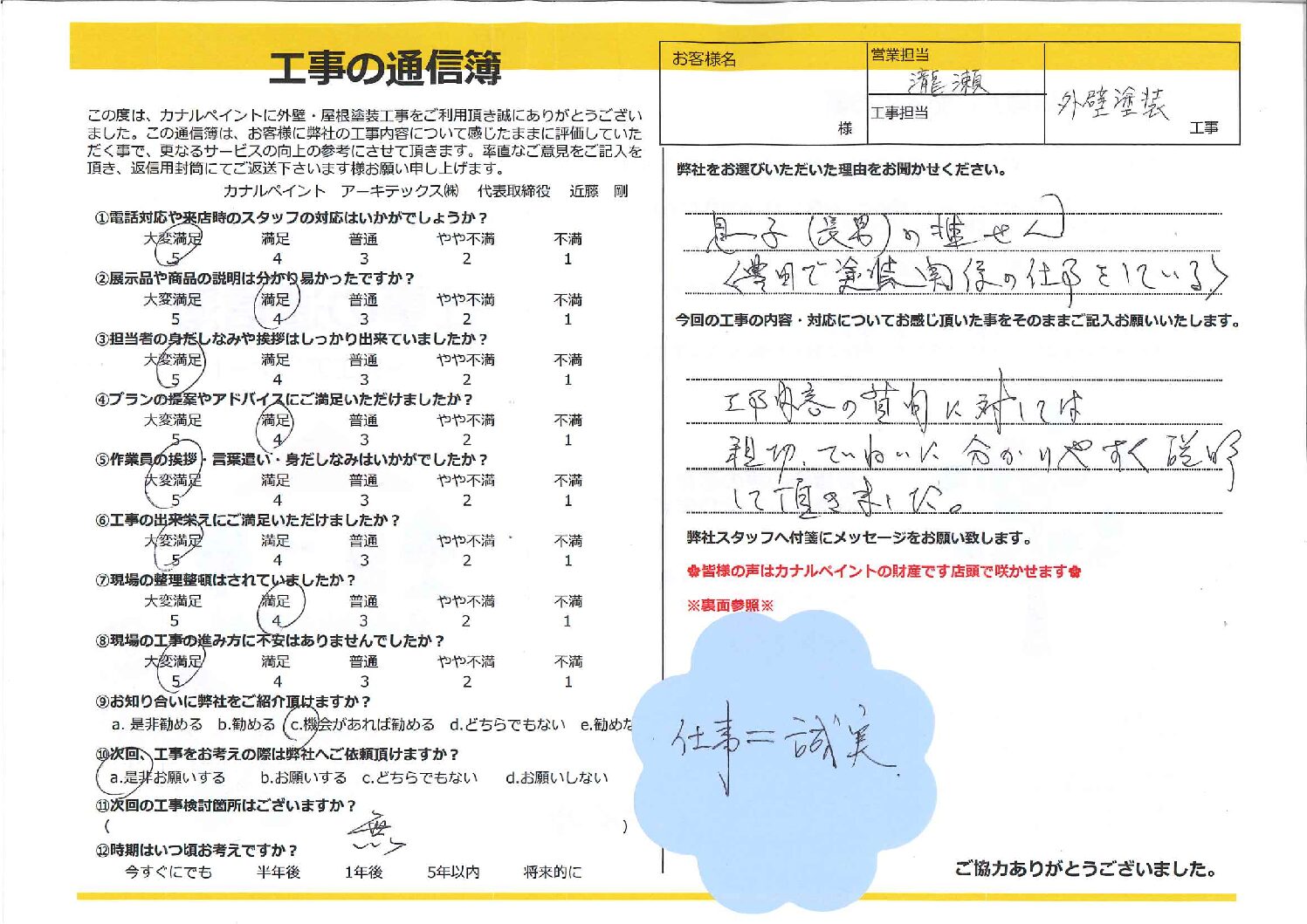 今回の工事の内容・対応についてお感じ頂いた事をそのままご記入お願いいたします。