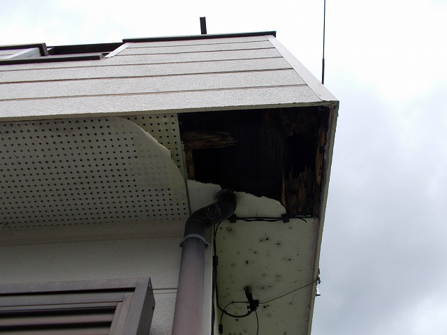 雨漏りが原因で、軒天の板が剥がれ落ちてしまっていました。